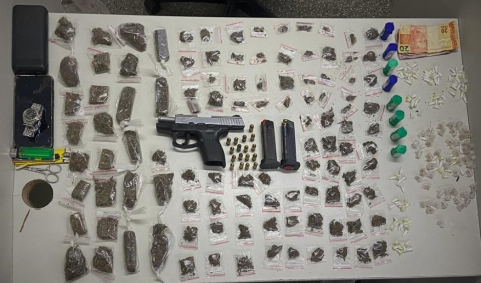 Na ação, os militares apreenderam uma pistola, mais de 100 pinos de cocaína e mais de 80 porções de maconha. Posteriormente, os suspeitos e o material foram apresentados na delegacia da Polícia Civil para adoção das medidas legais cabíveis.