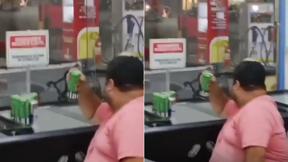 No vídeo, o homem aparece dentro de um bar, sentado e aparentemente calmo, mesmo com o som de disparos ao fundo. Em seguida, ele se levanta, observa a movimentação, volta a sentar e continua bebendo.