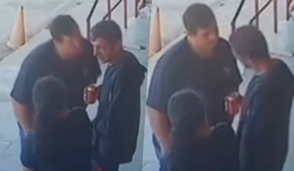 As imagens mostram dois homens conversando em frente a um bar. Em determinado momento, um deles saca uma faca e atinge o outro com golpes.