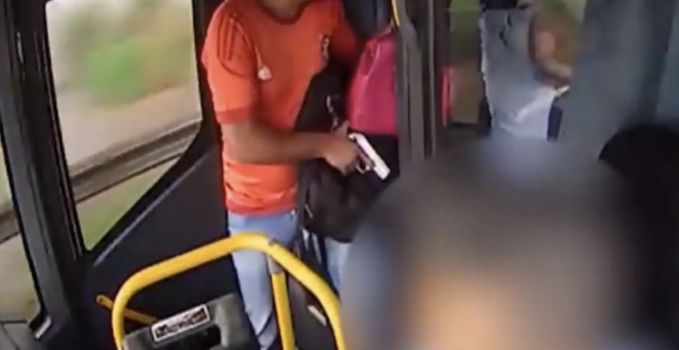 Nas imagens, um dos assaltantes aparece armado ao lado do motorista, enquanto outros dois recolhem os pertences dos passageiros. É possível ver o homem com a arma em punho agindo de forma violenta.