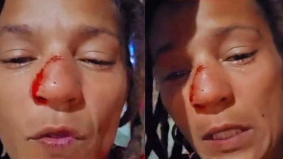 Imagens mostra a mulher com o nariz quebrado e sangrando. No vídeo, a vítima relata que um dos turistas tentou puxar o cabelo dela e que ela tentou filmar com o próprio celular, mas os agressores tomaram o aparelho da mão dela.