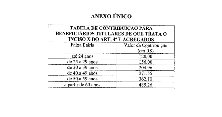 No caso dos cônjuges e companheiros(as), o valor será correspondente a 50% da contribuição do titular, mas também não poderá ser inferior a R$ 120,00. No caso dos demais dependentes, a contribuição será de 22% referente ao valor pago pelo titular.