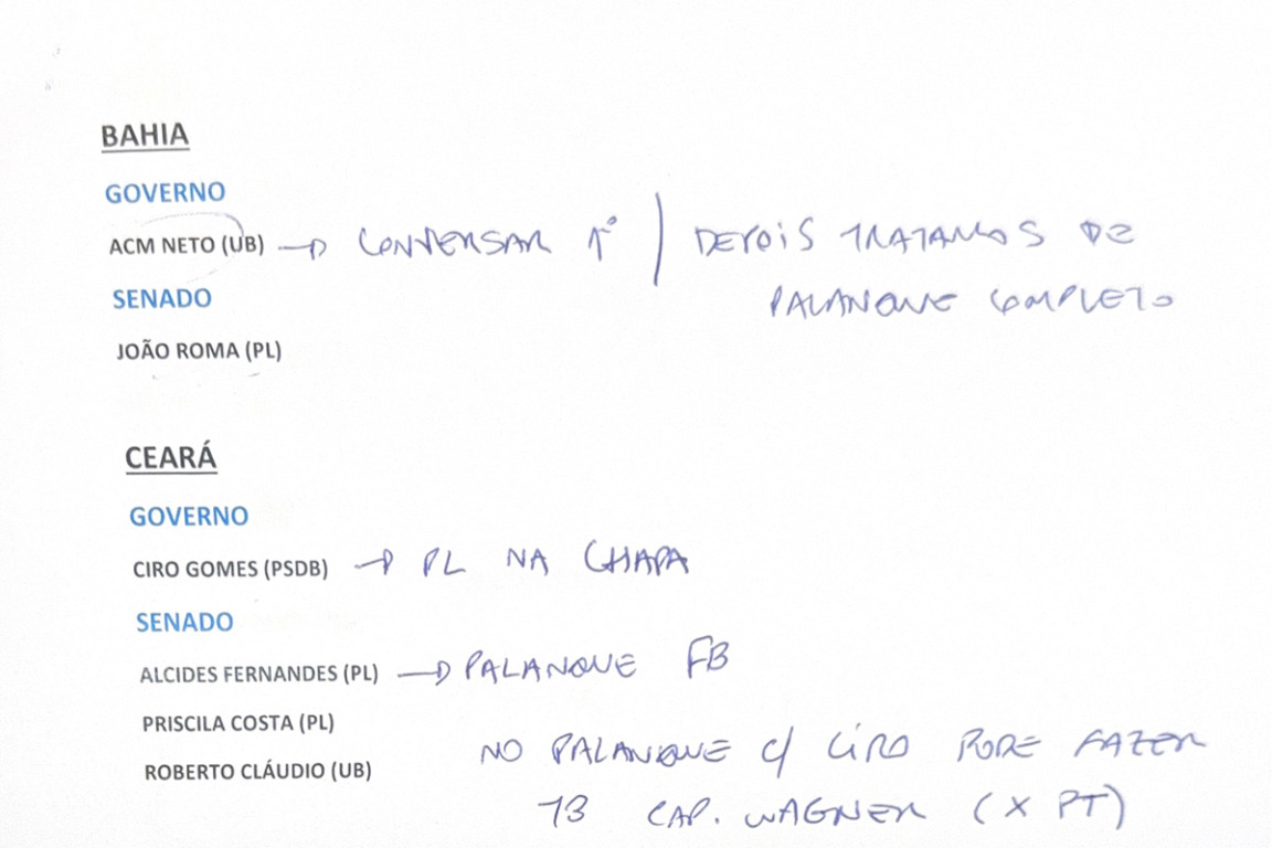Nos documentos, o pré-candidato apontou como certa a candidatura de João Roma, também do PL, na corrida pelo Senado. Em relação a ACM Neto, Flávio Bolsonaro anotou a observação de conversar primeiro e depois tratar do palanque completo.
