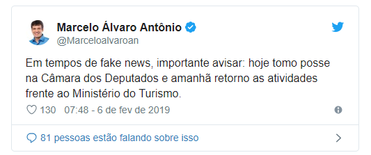 “Em tempos de fake news, importante avisar: Hoje tomo posse na Câmara dos Deputados e amanhã retorno às atividades frente ao Ministério do Turismo”, escreveu.