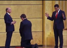 Bolsonaro levantou-se, os dois se abraçaram e o bispo disse que Deus está com ele, sendo aplaudido pelo público. A unção durou 5 minutos.