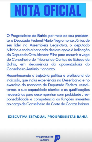 Além do presidente do partido, o deputado federal Mário Negromonte Júnior, a nota é atribuída ao líder do PP na Assembleia Legislativa (Alba), deputado Niltinho, e a toda a bancada da agremiação.
