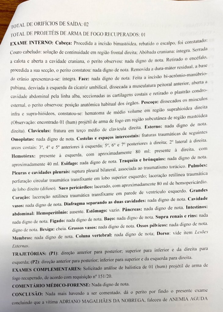 O perito criminal acrescentou ainda que a necropsia no corpo de Adriano atestou duas perfurações por arma de fogo, nas regiões entre o pescoço e a clavícula, além do tórax. "Os resultados dos outros laudos, assim que finalizados, serão entregues ao Departamento de Repressão e Combate ao Crime Organizado (Draco), que apura o caso", completou o diretor.