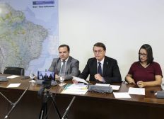 O presidente Jair Bolsonaro faz transmissão ao vivo ao lado do ministro da Secretaria-Geral da Presidência, Jorge Francisco, e da intérprete de libras, Elizângela Castelo Branco.