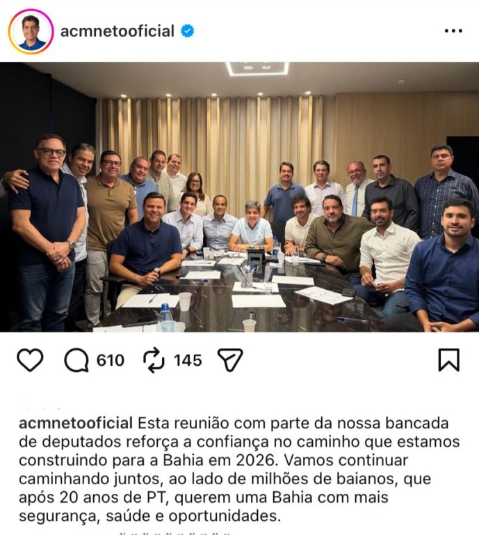 Na legenda da foto publicada, o ex-prefeito afirmou que o encontro reforça a confiança “no caminho” que o grupo está construindo para a Bahia em 2026, ano em que pretende disputar o governo do estado.
