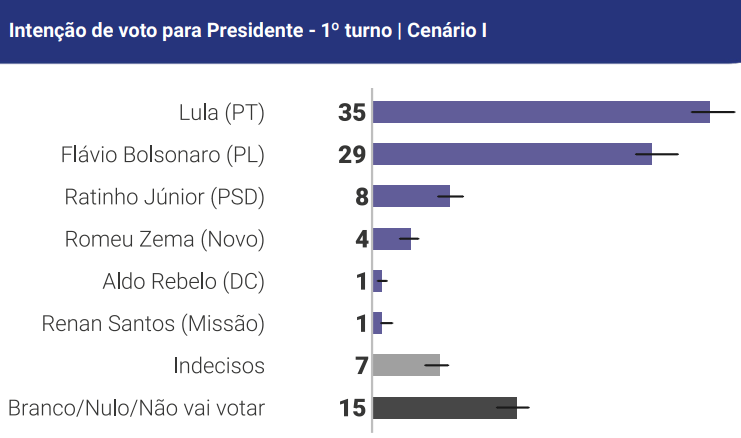 Nesta quarta-feira (11), o instituto de pesquisa Quaest divulgou um levantamento que mostra o presidente Lula liderando a corrida presidencial em sete cenários. O estudo traz o senador e pré-candidato Flávio Bolsonaro (PL) no segundo lugar. Esse foi o primeiro mapeamento de intenção de votos para presidente que não menciona o governador de São Paulo, Tarcísio de Freitas (Republicanos), que tem negado a intenção de concorrer ao Palácio do Planalto.