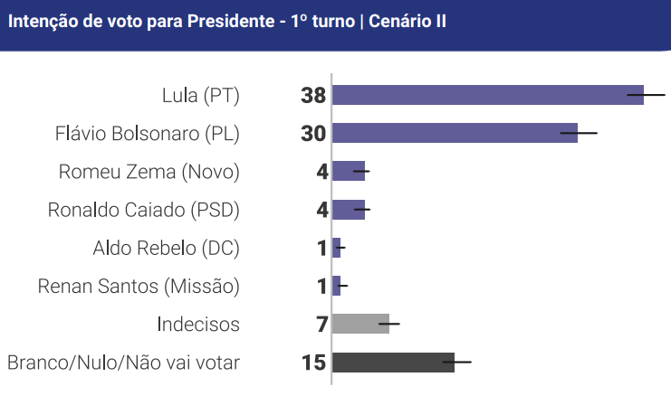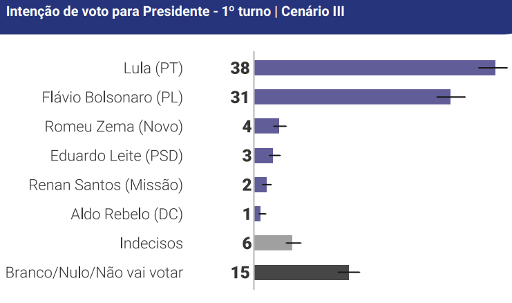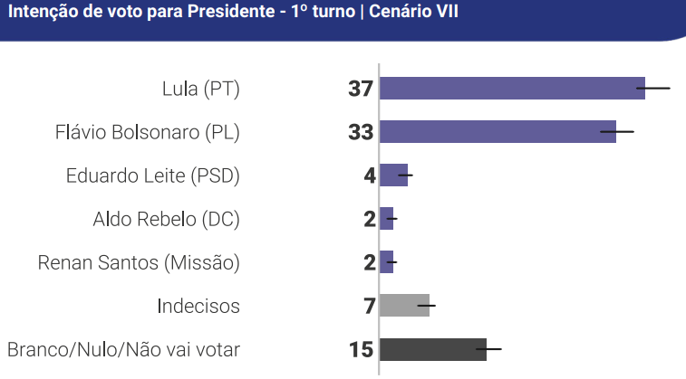 Todos os sete cenários são referentes à intenção de voto para o primeiro turno. Confira, a seguir, a relação completa de todos os cenários testados pelo Quaest na pesquisa feita em parceria com a Genial Investimentos: