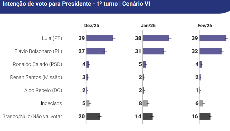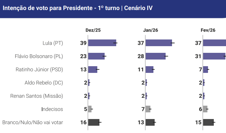 A pesquisa foi realizada com entrevistas presenciais entre os dias 5 e 9 de fevereiro em 120 municípios. Foram ouvidos 2.004 eleitores e a margem de erro é de 2%. O nível de confiança é de 95%. O levantamento foi registrado no Tribunal Superior Eleitoral (TSE) sob o número BR-00249/2026.