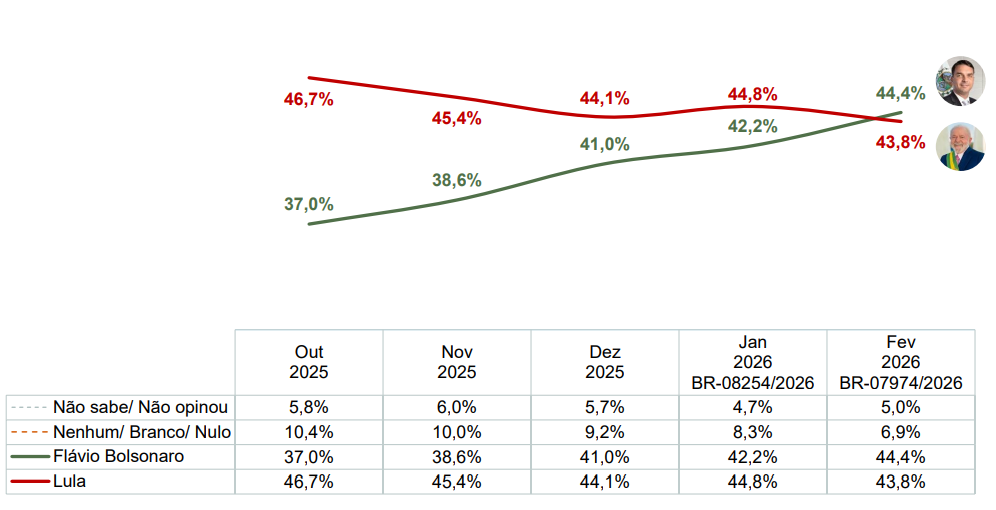 Nesta quinta-feira (26), o instituto AtlasIntel divulgou uma pesquisa em que Flávio Bolsonaro registra 46,3% das intenções de voto, enquanto Lula tem 46,2% em eventual disputa de segundo turno.