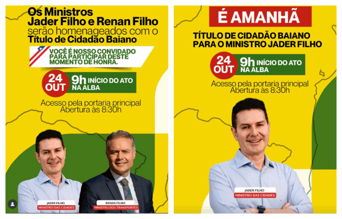 Nas redes sociais, o MDB Bahia, partido ao qual os dois ministros são filiados, vinha fazendo a divulgação da homenagem aos políticos. No entanto, nesta quinta, após o ato no Centro Administrativo da Bahia (CAB), o partido passou a divulgar a sessão para homenagem apenas para Jader Filho.