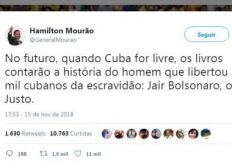 O vice-presidente eleito, general Hamilton Mourão (PRTB), afirmou que com o anúncio da saída dos cubanos do programa Mais Médicos, o presidente eleito, Jair Bolsonaro (PSL), "libertou 8 mil cubanos da escravidão".