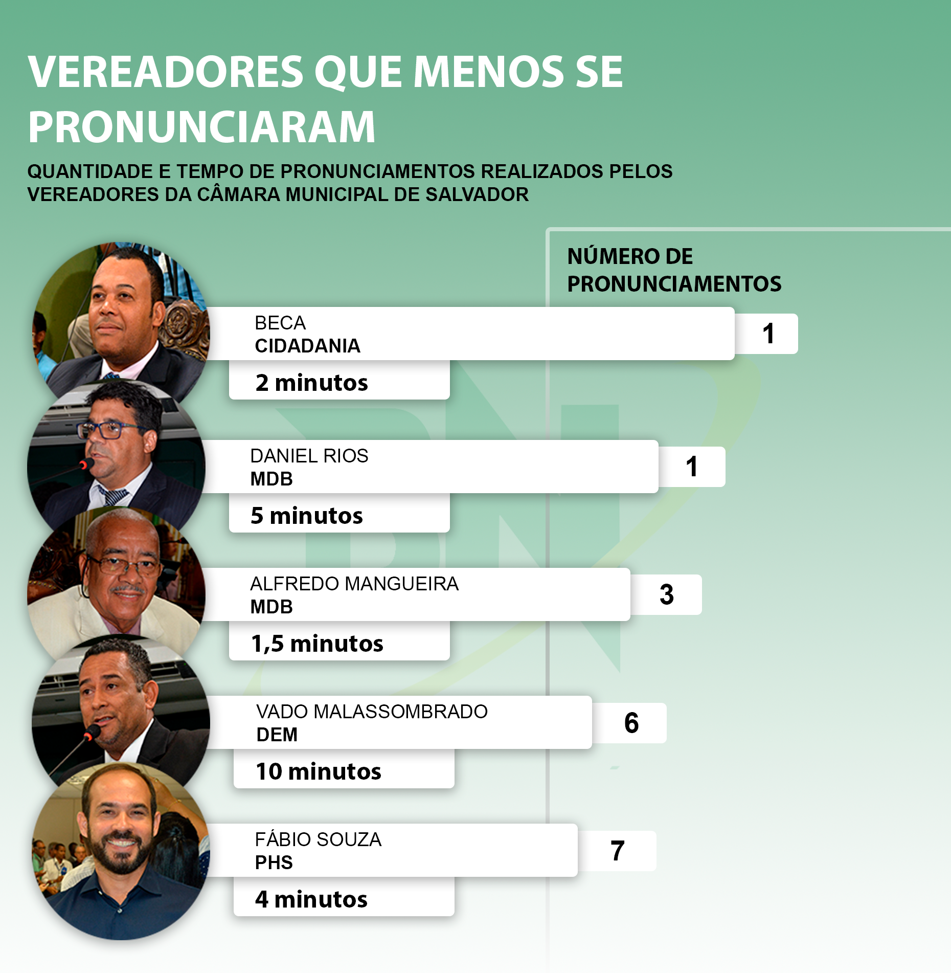 No top 5 dos mais calados, curiosamente, todos os edis são da base do prefeito ACM Neto (DEM). No topo da lista está Beca (Cidadania). Ele fez apenas um pronunciamento no plenário ou tribuna da Casa. No total, ele esteve dois minutos nos microfones da Casa.