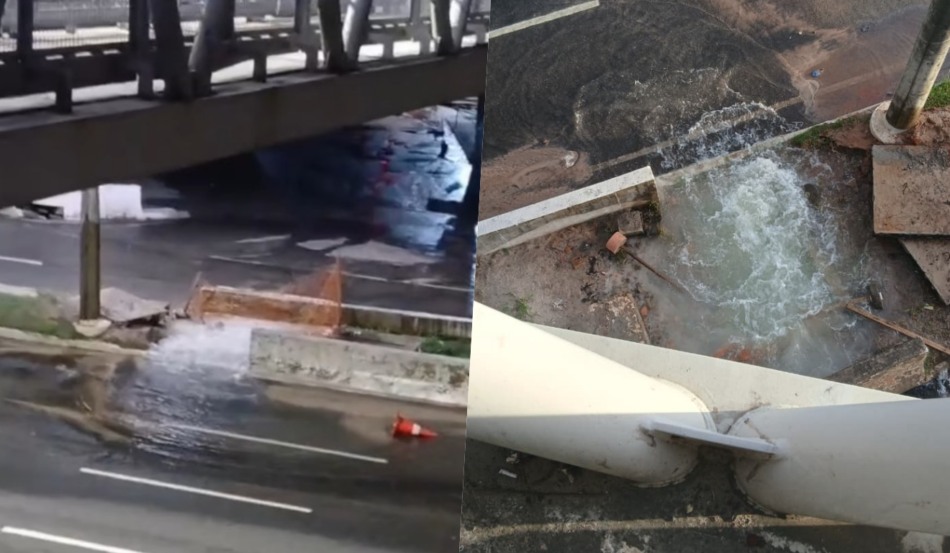 O rompimento ocorre nas proximidades do acesso ao bairro, no sentido Aeroporto da via. A força da água invadiu a pista e levou à interdição parcial das faixas.