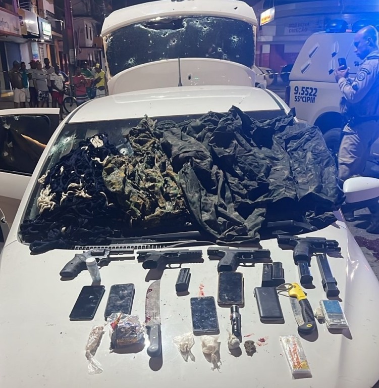 “Armas, carregadores, munições e drogas foram apreendidos com o quarteto”, informou a SSP-BA. Dentre os materiais apreendidos estão três pistolas, um revólver e um facão. Nenhum policial ficou ferido na ação.